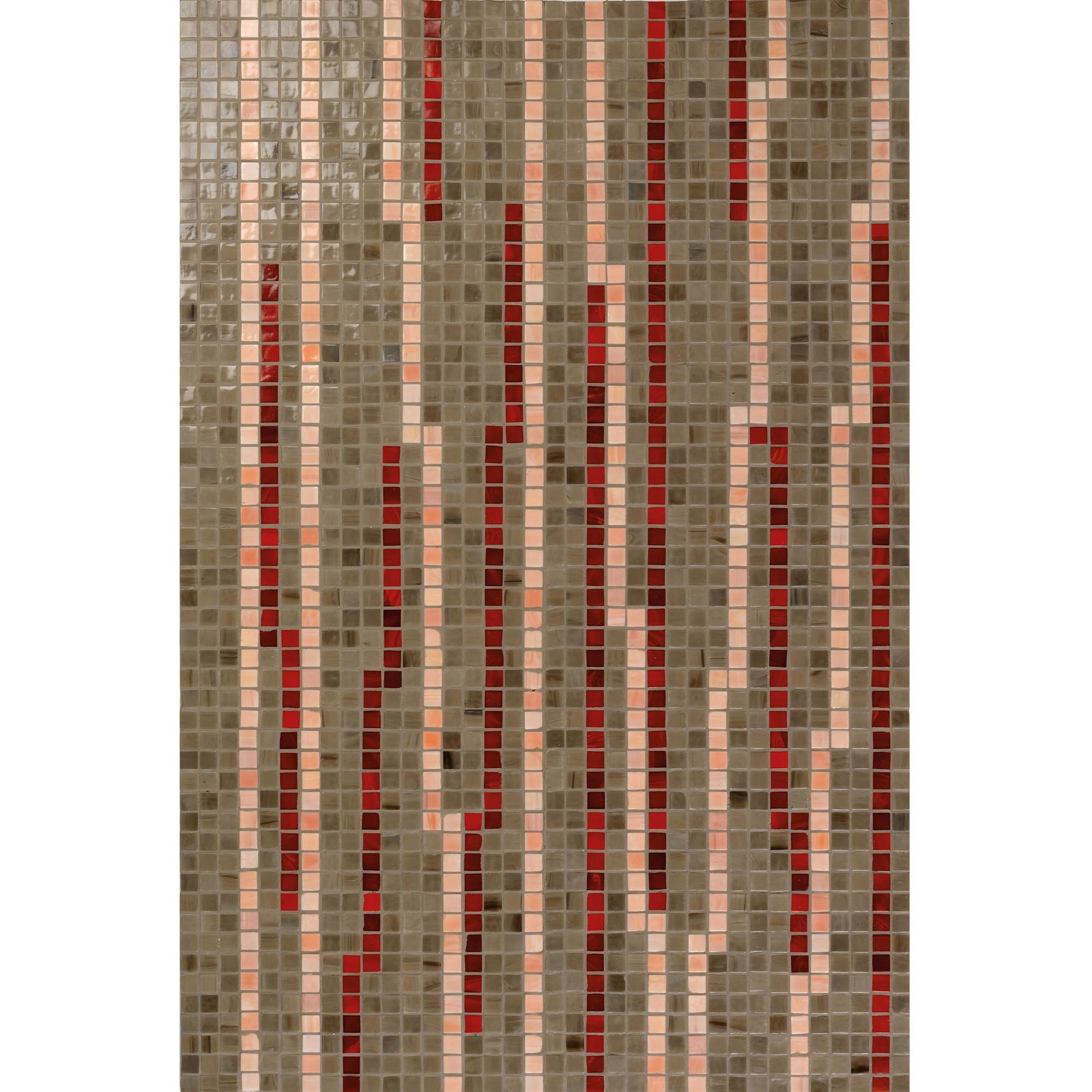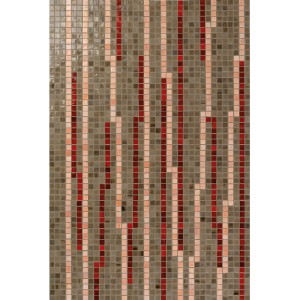 Ein mehrfarbiges Glasmosaik in vier Farbvarianten, das die geringe Größe der Mosaiksteine (1,5×1,5 cm, Dicke 4 mm) ausnutzt, um eine Abfolge von vertikalen Segmenten zu gestalten, die an einen Vorhang aus Bambusrohren erinnern.