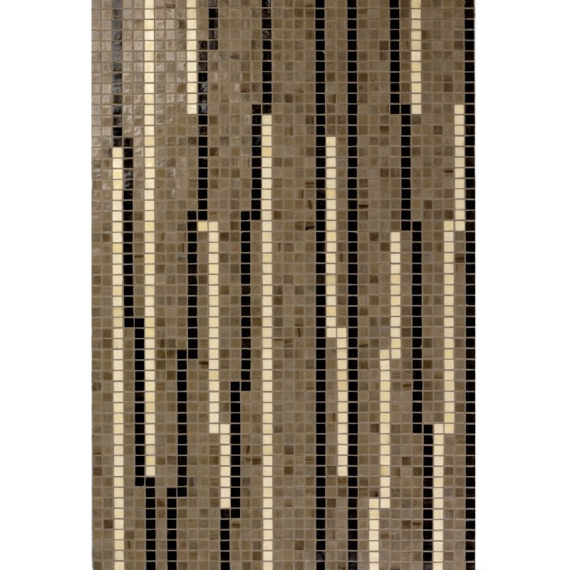 Ein mehrfarbiges Glasmosaik in vier Farbvarianten, das die geringe Größe der Mosaiksteine (1,5×1,5 cm, Dicke 4 mm) ausnutzt, um eine Abfolge von vertikalen Segmenten zu gestalten, die an einen Vorhang aus Bambusrohren erinnern.