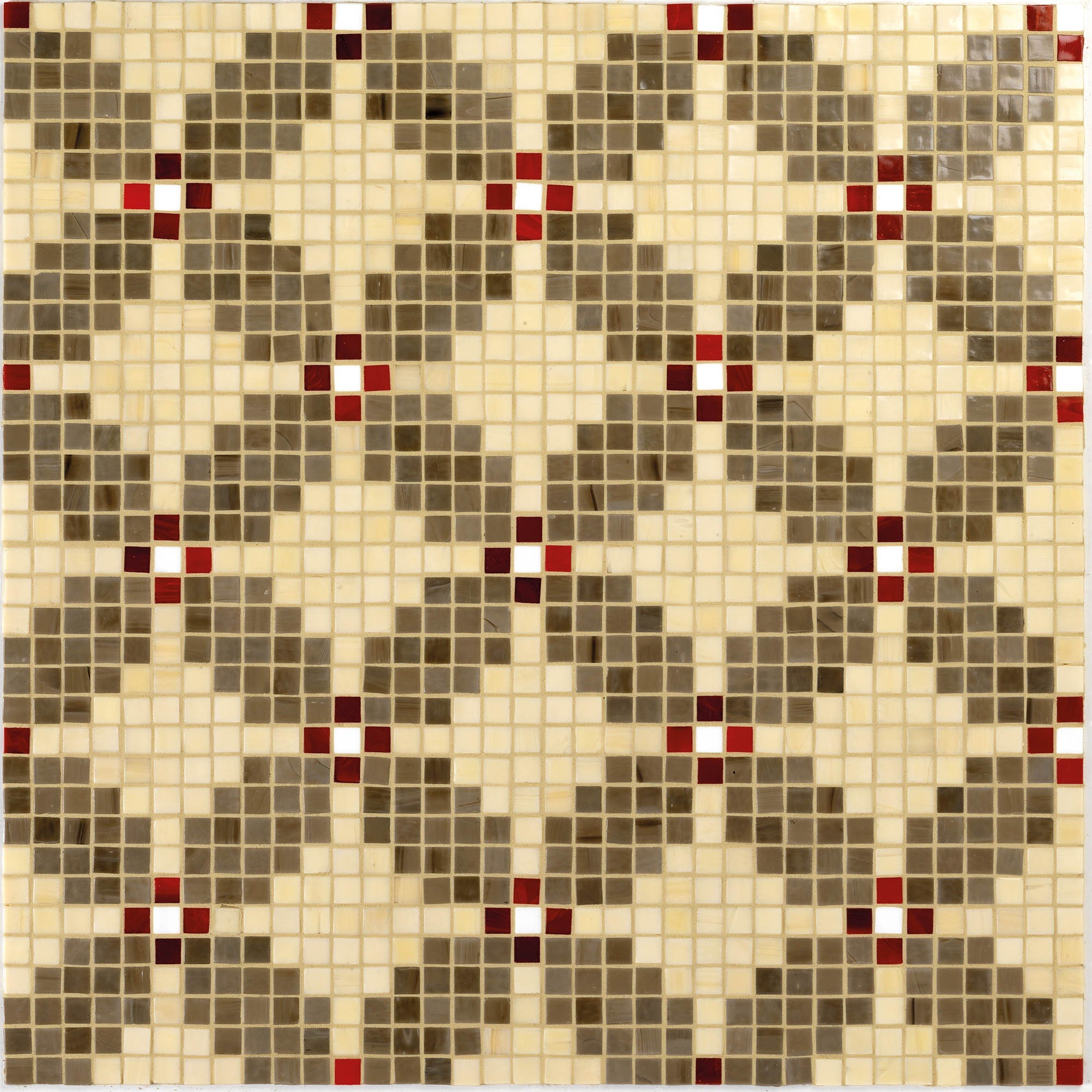 Dieses Muster ist aus 1,5×1,5 cm großen Fliesen der Serie R.A.L. aufgebaut: Winzige Blumen markieren regelmäßig die Schnittpunkte eines Gewebes, das sich entlang der beiden Diagonalen entwickelt.