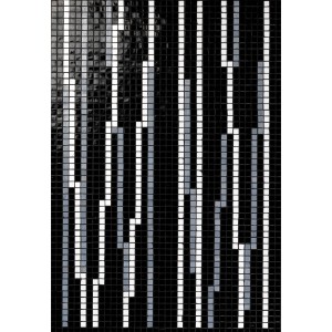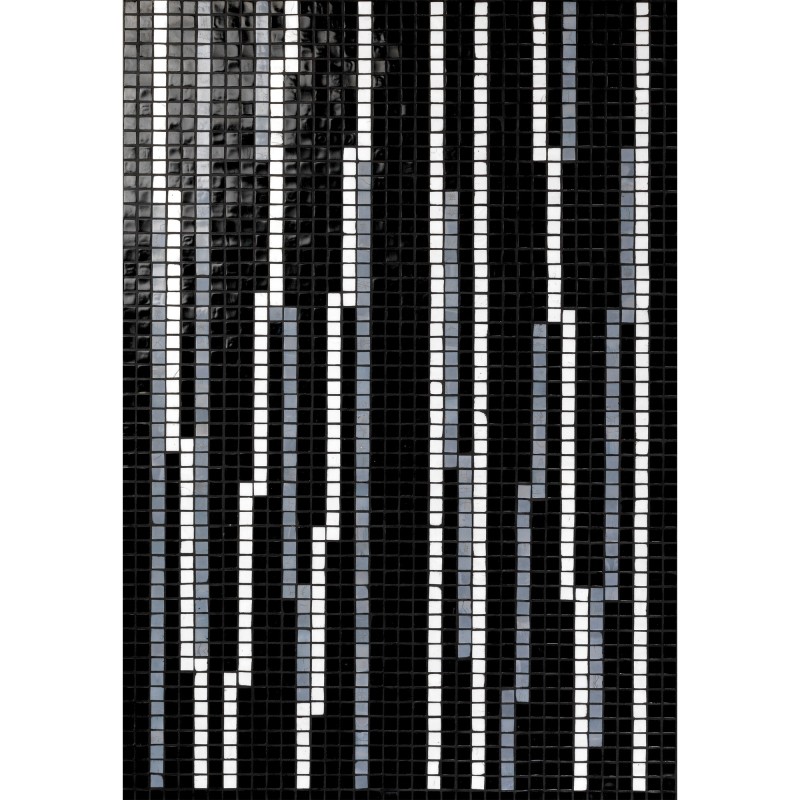 Ein mehrfarbiges Glasmosaik in vier Farbvarianten, das die geringe Größe der Mosaiksteine (1,5×1,5 cm, Dicke 4 mm) ausnutzt, um eine Abfolge von vertikalen Segmenten zu gestalten, die an einen Vorhang aus Bambusrohren erinnern.