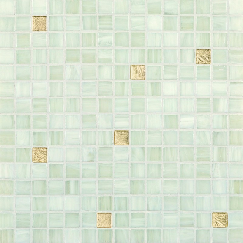 Eine Kollektion von Glasmosaiken, die durch das Vorhandensein von goldähnlichen Fliesen mit Gelbgold- oder Weißgold-Effekt vereint werden, die nach dem Zufallsprinzip über das Modul verteilt sind (7 Fliesen pro Platte).