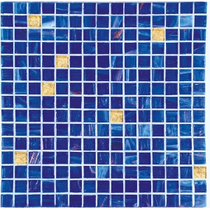 Eine Kollektion von Glasmosaiken, die durch das Vorhandensein von goldähnlichen Fliesen mit Gelbgold- oder Weißgold-Effekt vereint werden, die nach dem Zufallsprinzip über das Modul verteilt sind (7 Fliesen pro Platte).