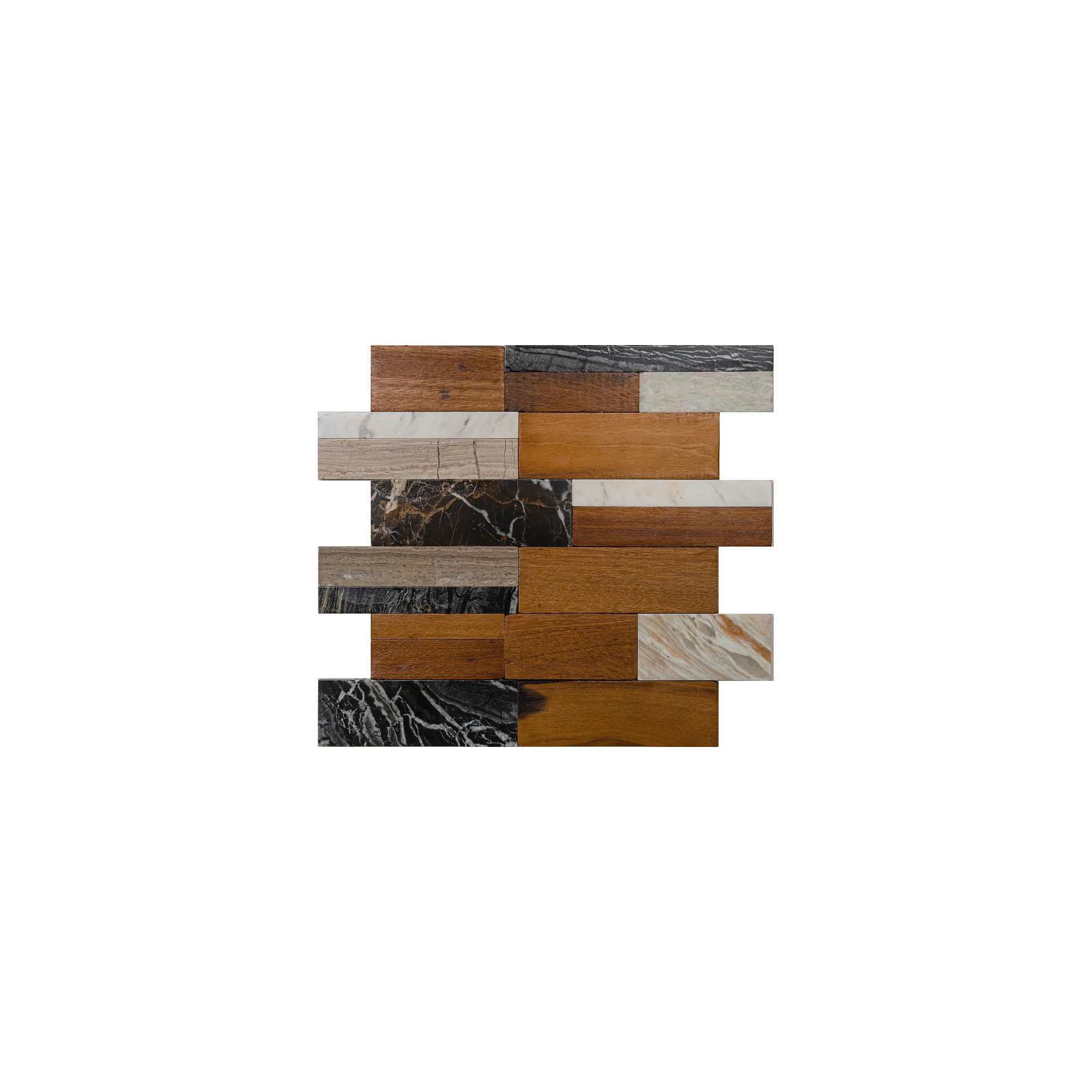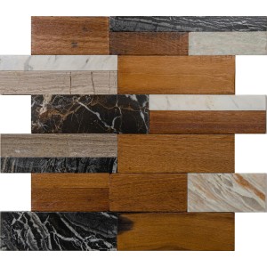 Die mineralische Energie von Stein trifft auf die Wärme und Natürlichkeit von Holz: New Look ist ein Multimaterial-Mosaik, das Elemente aus sechs Natursteinsorten und Elemente aus aufgearbeitetem nautischem Holz kombiniert.