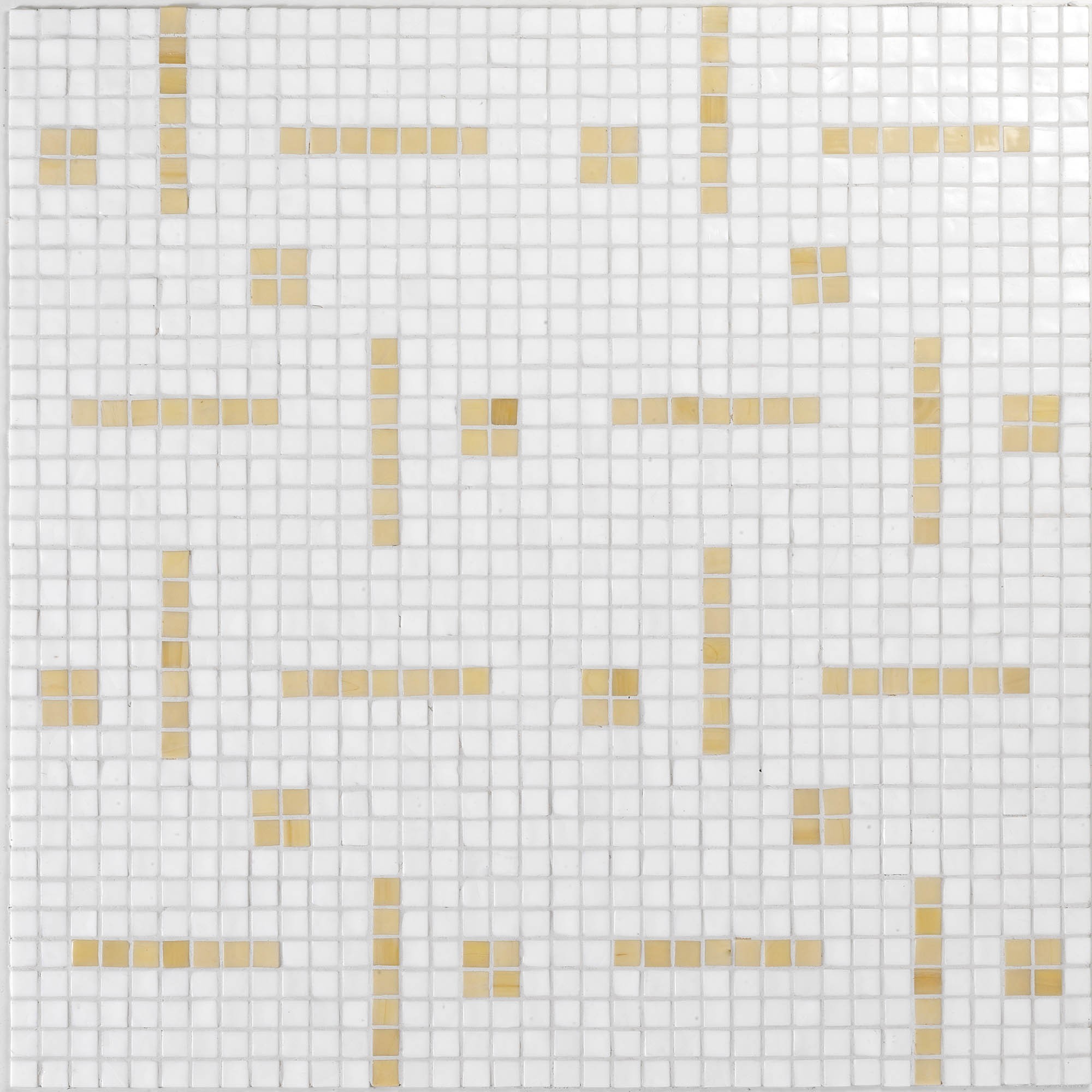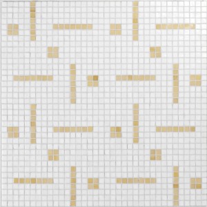 Bei diesem Glaspasten Mosaik erscheint der Wechsel von Punkten und Linien auf der verlegten Fläche auf den ersten Blick zufällig, was auf die unterschiedliche Ausrichtung der Segmente zurückzuführen ist, die mal horizontal und mal vertikal verlaufen.