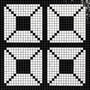 Die Verwendung von nur zwei Farben erzeugt einen starken Kontrast, der die grafische Komponente hervorhebt: ein geordnetes Gitter aus Quadraten, die in Rahmen eingefasst sind. Die Fliesen messen 1,5×1,5 cm und sind 4 mm dick. Sie stammen aus der Serie R.A.L. und ermöglichen es, jedes dieser Mosaike mit monochromen Modulen in einer der beiden Farben zu kombinieren, aus denen sie bestehen.