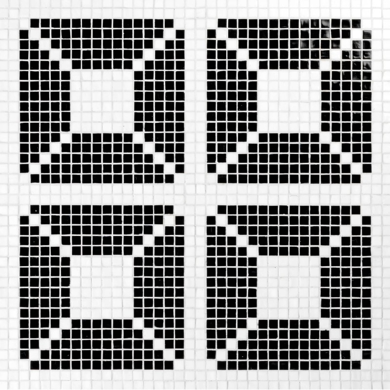 Die Verwendung von nur zwei Farben erzeugt einen starken Kontrast, der die grafische Komponente hervorhebt: ein geordnetes Gitter aus Quadraten, die in Rahmen eingefasst sind. Die Fliesen messen 1,5×1,5 cm und sind 4 mm dick. Sie stammen aus der Serie R.A.L. und ermöglichen es, jedes dieser Mosaike mit monochromen Modulen in einer der beiden Farben zu kombinieren, aus denen sie bestehen.