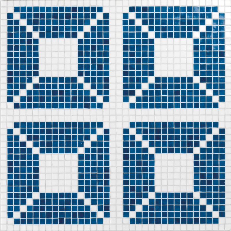 Die Verwendung von nur zwei Farben erzeugt einen starken Kontrast, der die grafische Komponente hervorhebt: ein geordnetes Gitter aus Quadraten, die in Rahmen eingefasst sind. Die Fliesen messen 1,5×1,5 cm und sind 4 mm dick. Sie stammen aus der Serie R.A.L. und ermöglichen es, jedes dieser Mosaike mit monochromen Modulen in einer der beiden Farben zu kombinieren, aus denen sie bestehen.