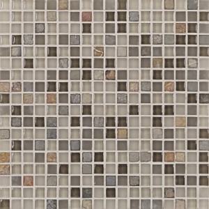 Slate ist ein Mosaik, bei dem rustikaler Stein (Schiefer) und Kristallglassteine frei gemischt werden, wobei letztere sowohl eine matte als auch eine glänzende Oberfläche haben.