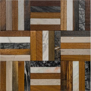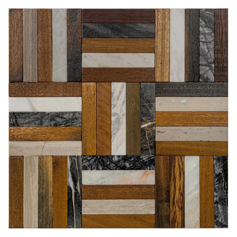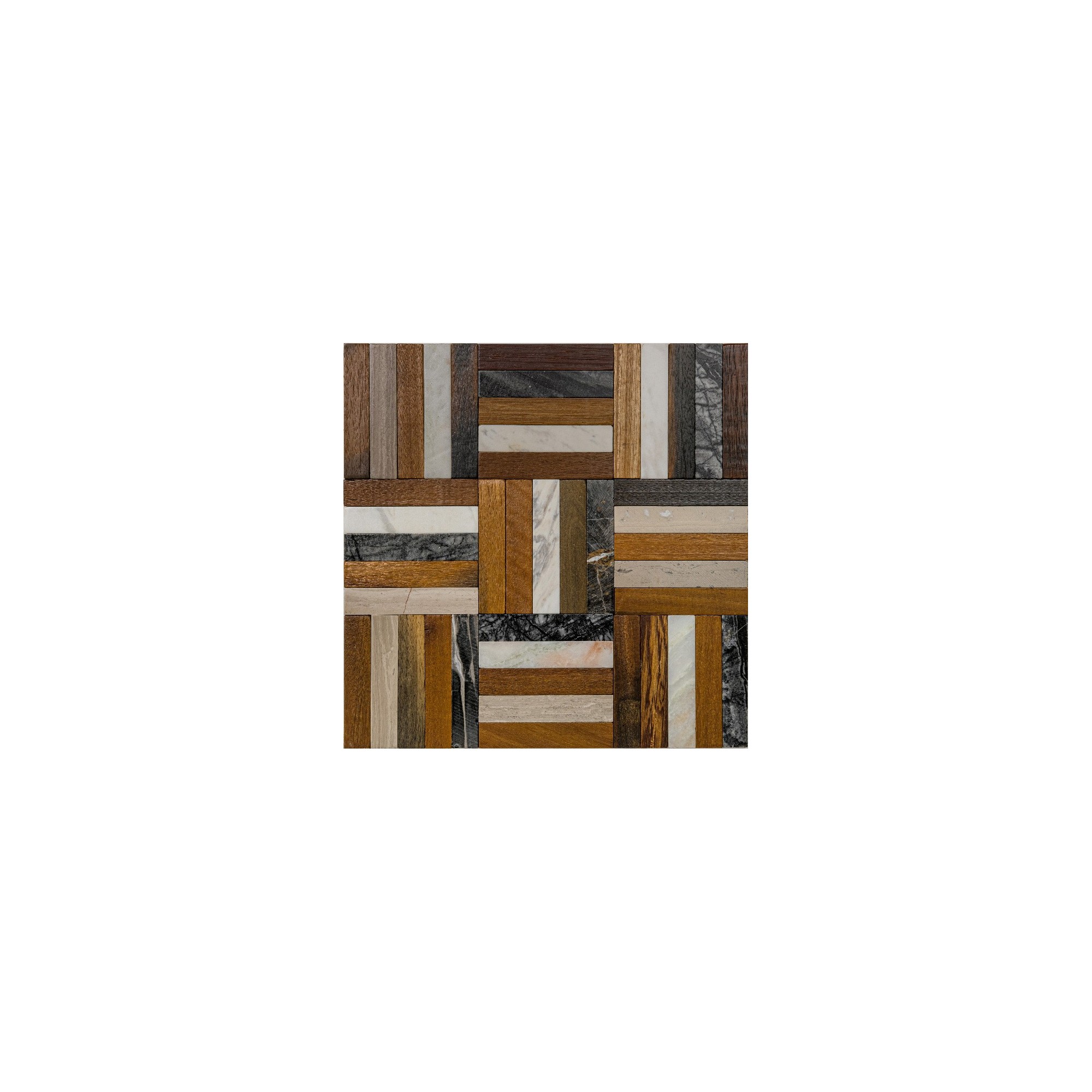 Mosaico in legno nautico di recupero e pietra naturale, idoneo per pavimenti e rivestimenti interni residenziali e pubblici; adatto anche per bagni e cucine.