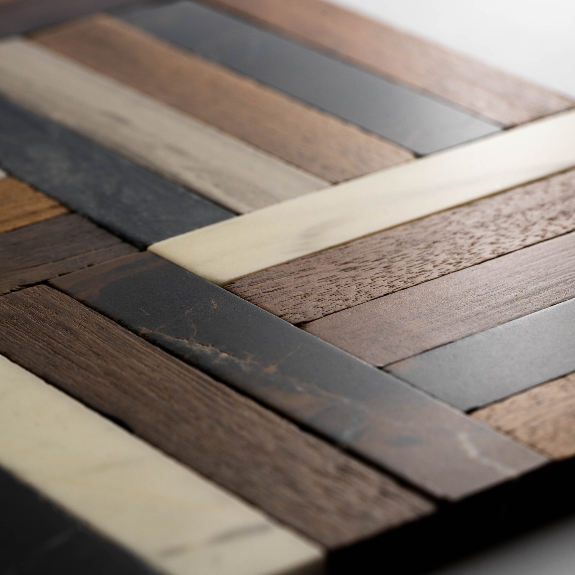 L’energia minerale della pietra incontra il calore e la naturalità del legno: New Look è un mosaico multimaterico che combina elementi tratti da sei tipologie di pietra naturale ed elementi in legno nautico di recupero.