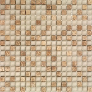 Un mosaico che alterna vetro e pietra naturale per dare origine a miscele cromaticamente ben identificabili, mosse e variegate grazie al gran numero di sfumature tipiche della pietra naturale.