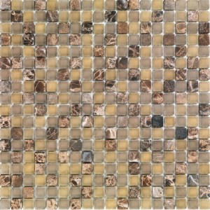Un mosaico che alterna vetro e pietra naturale per dare origine a miscele cromaticamente ben identificabili, mosse e variegate grazie al gran numero di sfumature tipiche della pietra naturale.